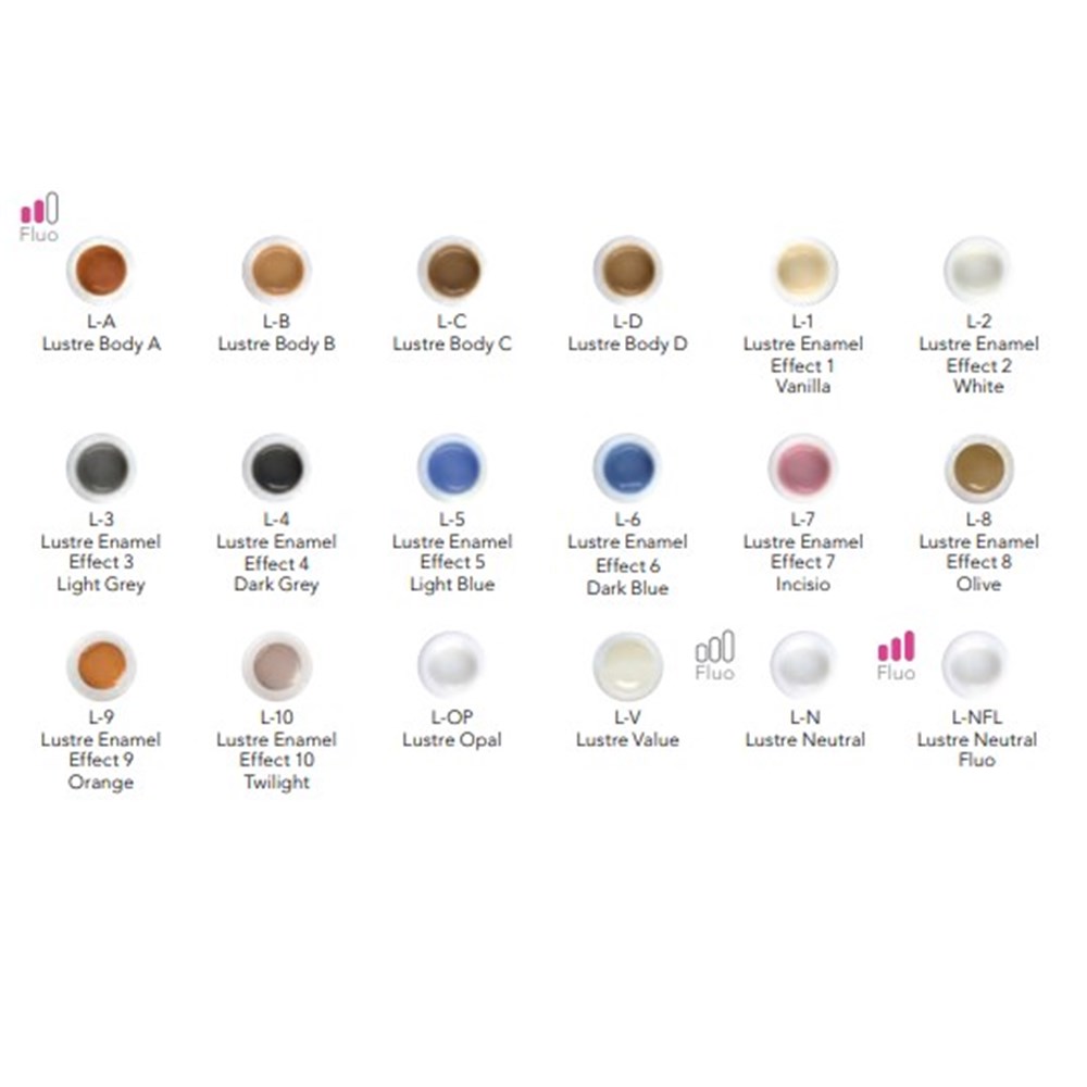 The Lustre Pastes ONE are specially developed to boost the fluorescence of monolithic restorations. Fluorescence can be boosted with Lustre Neutral FLUO (L-NFL).