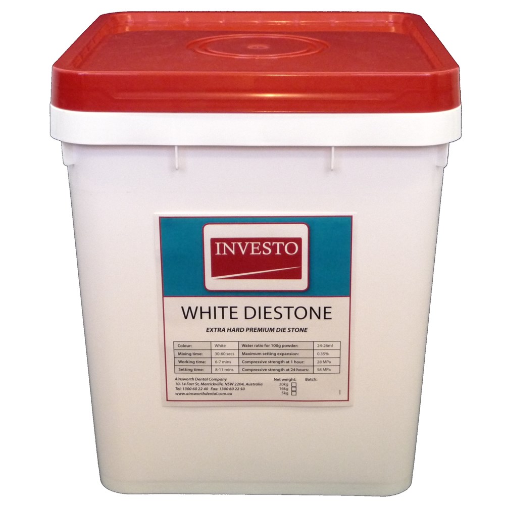 Investo White Diestone is a very hard type IV die stone which sets to a smooth clean surface. It is ideal for models which require a maximum setting expansion of the stone with a very hard final set. Recommended for acrylic dentures.