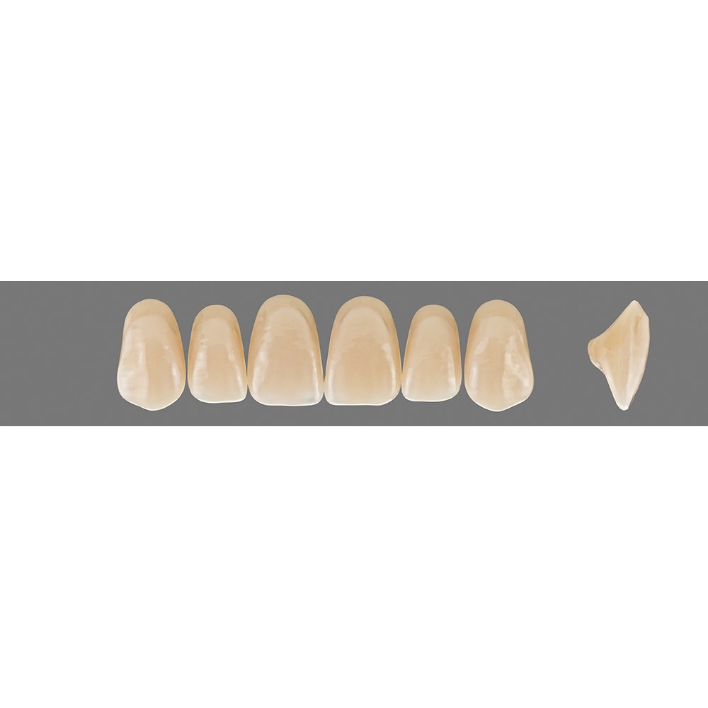 Basic anterior teeth made of HC polymer with multifunctional occlusal surfaces.