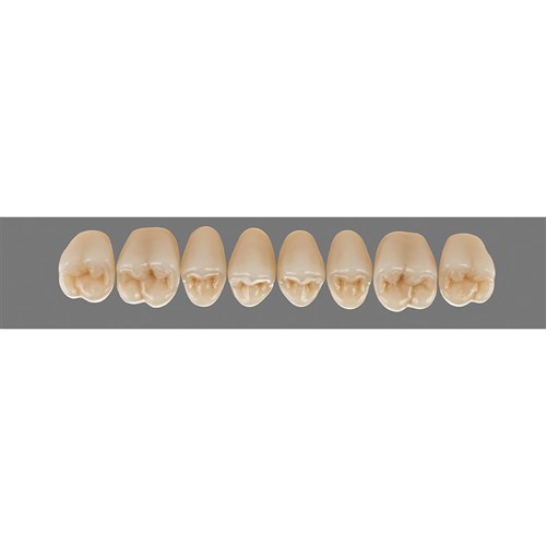 Basic posterior teeth made of HC polymer with multifunctional occlusal surfaces.