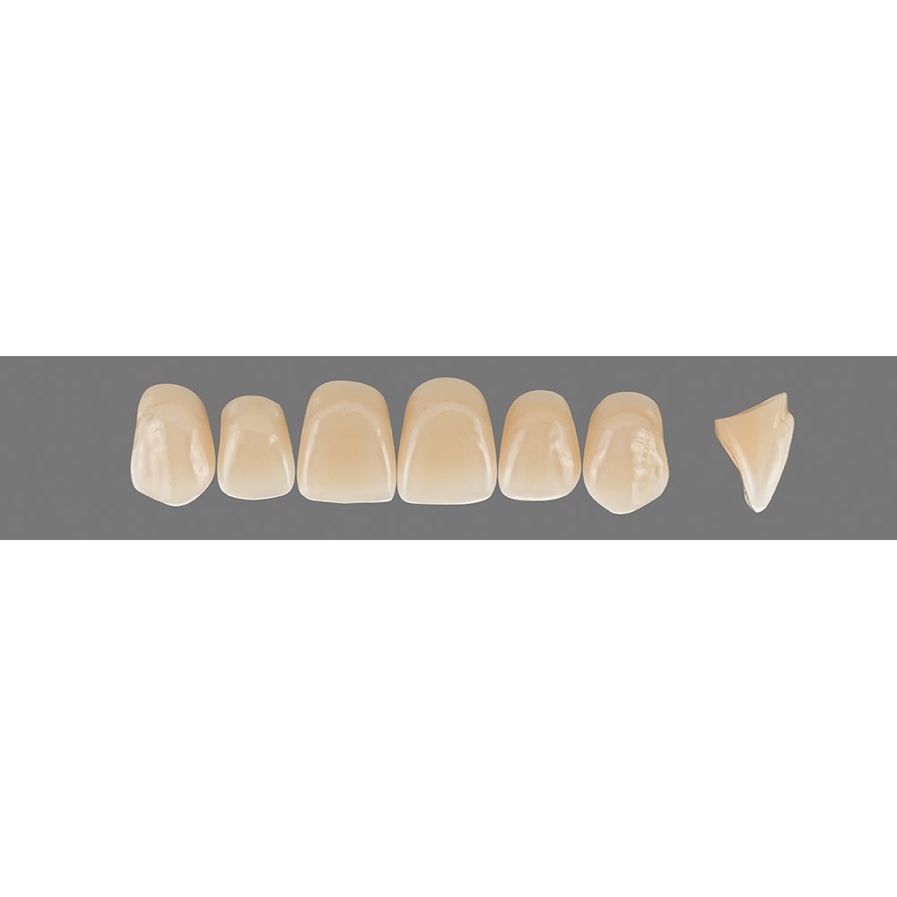Age-appropriate, universal anterior teeth made of MRP composite.
