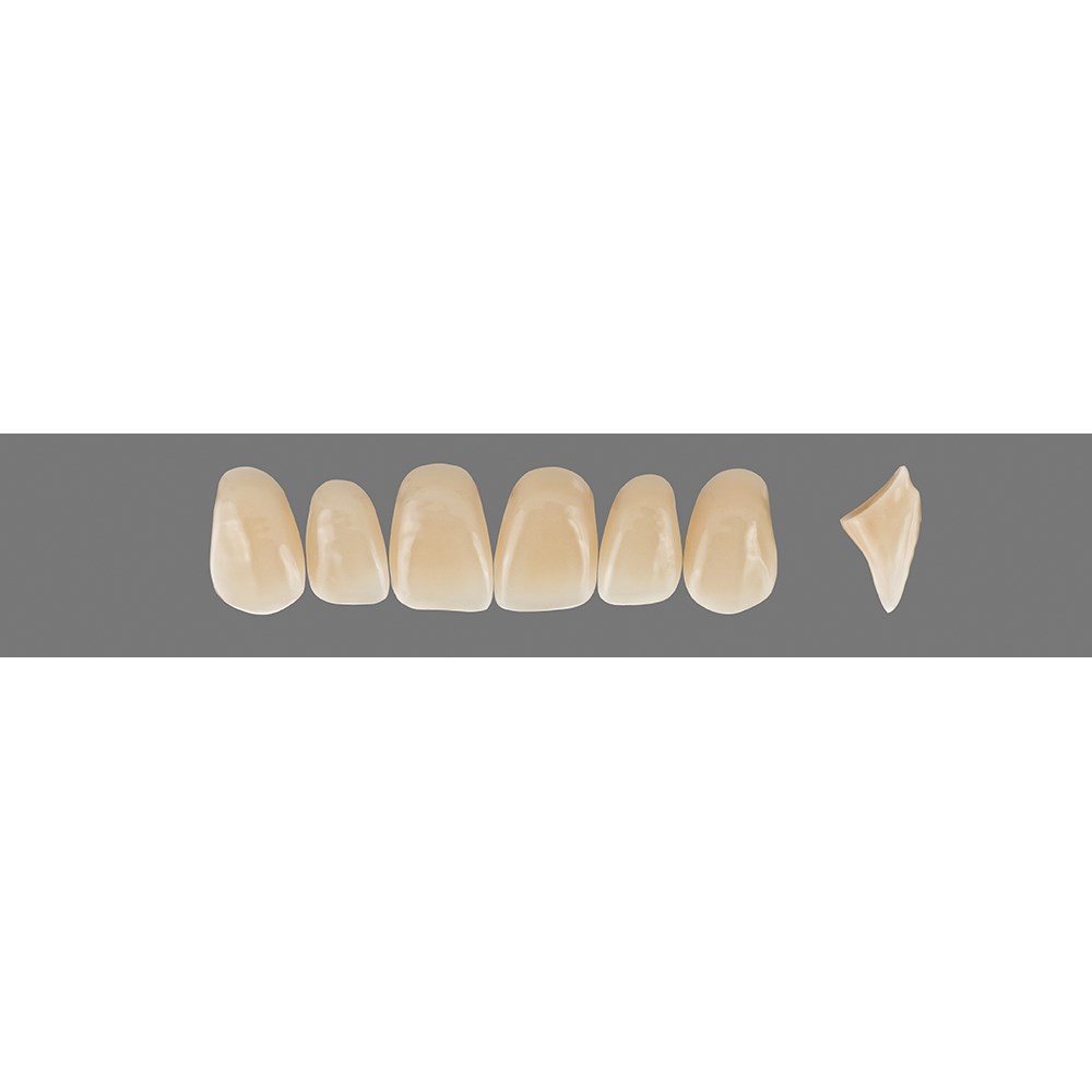 Age-appropriate, universal anterior teeth made of MRP composite.