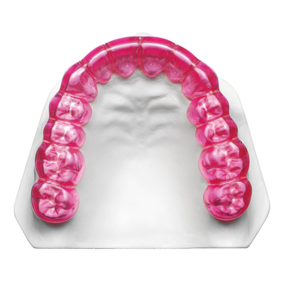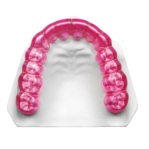 Pressure moulding material made of thermoplastic polyurethane for use with DURASOFT® pd. Forms a robust inner layer and provides high quality hard-soft splints with excellent resistance against discolouration. Available in clear, blue and magenta. Application Discolouration resistant inner layer for DURASOFT® pd splints. Specifically designed for long-term use splints such as intra-oral anti-snoring devices.