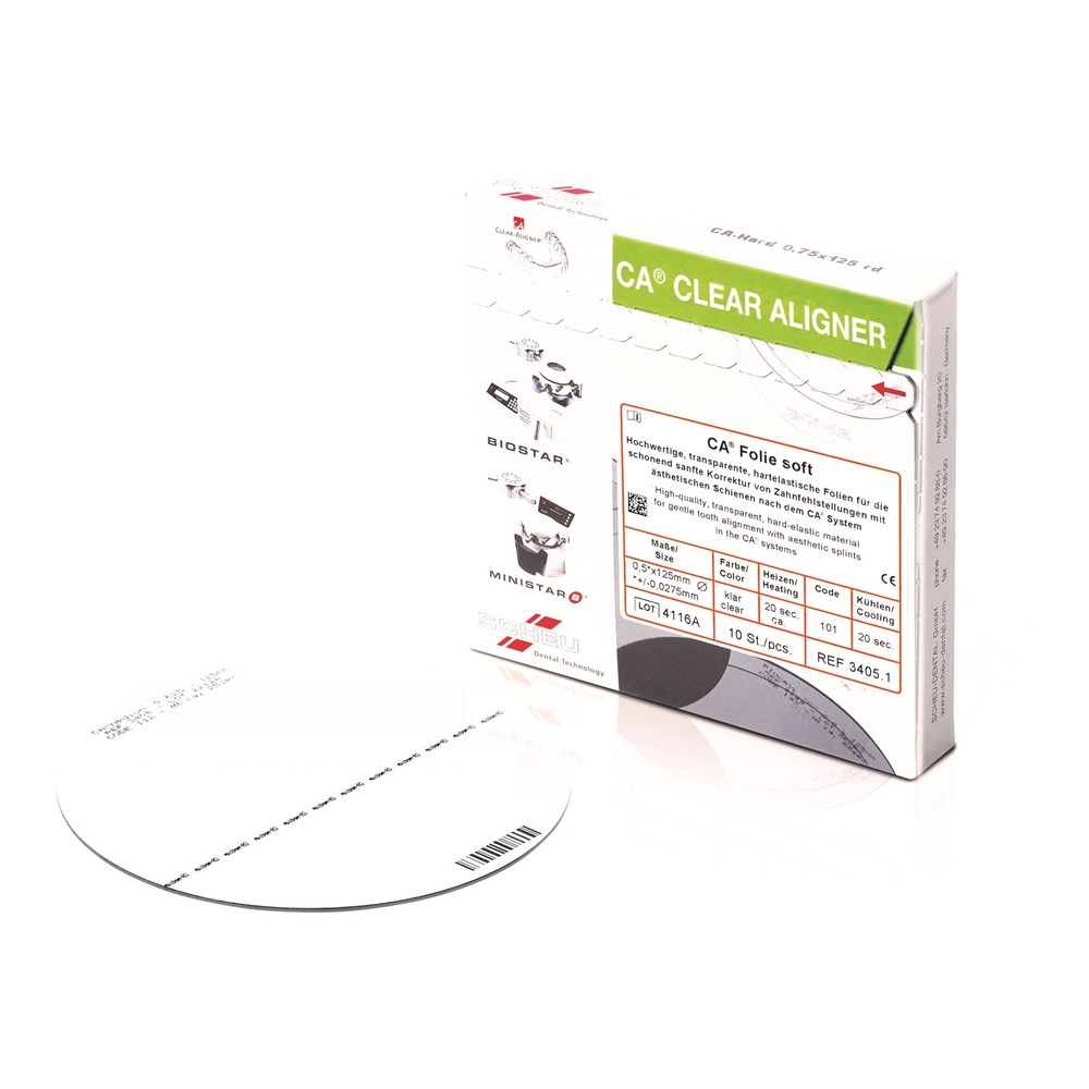 High-quality, transparent, hard-elastic material for gentle tooth alignment with aesthetic splints in the CA® system. Material with original CA® labelling stating the thickness: extra soft (0.4 mm), soft (0.5 mm), medium (0.625 mm) and hard (0.75 mm).