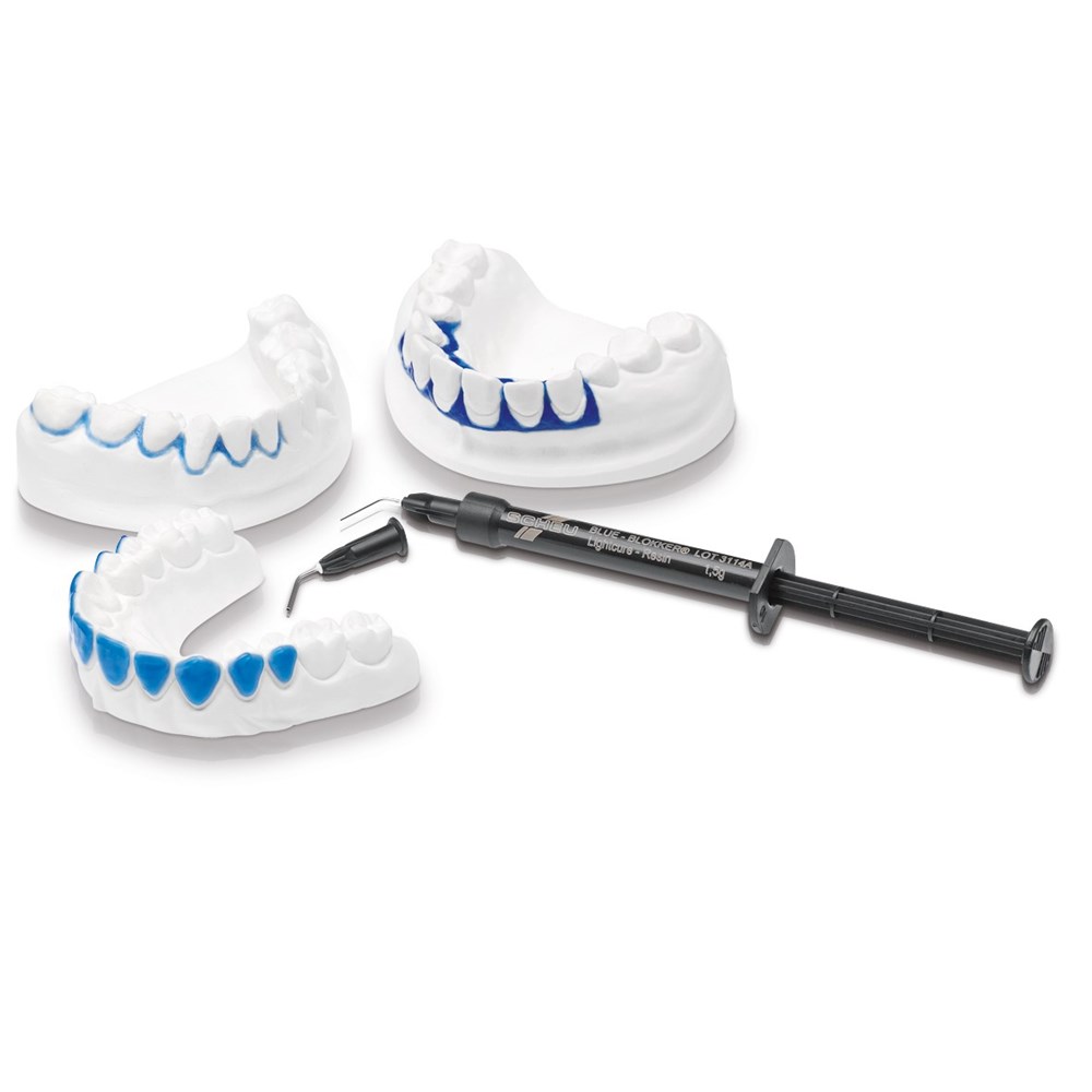 Light curing, blue opaque blocking out putty for fabrication of space maintainer for pressure moulded bleaching splints as well as for periodontal splints. Can also be used for sealing of the sawing cuts for set-up models Set includes 4 x 1.5g syringes & 10 cannulas