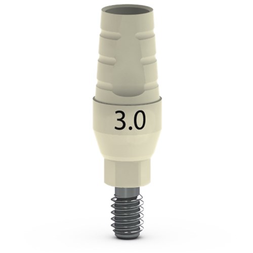 Use for table top or intra-oral scanning. May also be used for fabrication of cement- or screw-retained provisional restorations (up to 30 days). Packaged with an abutment screw (PXAS). PEEK (PolyEtherEtherKetone) material. Final torque: 30 Ncm. Note: Prior to scanning, verify that the scan abutment is available in the library of the design software that will be used to design the abutment.