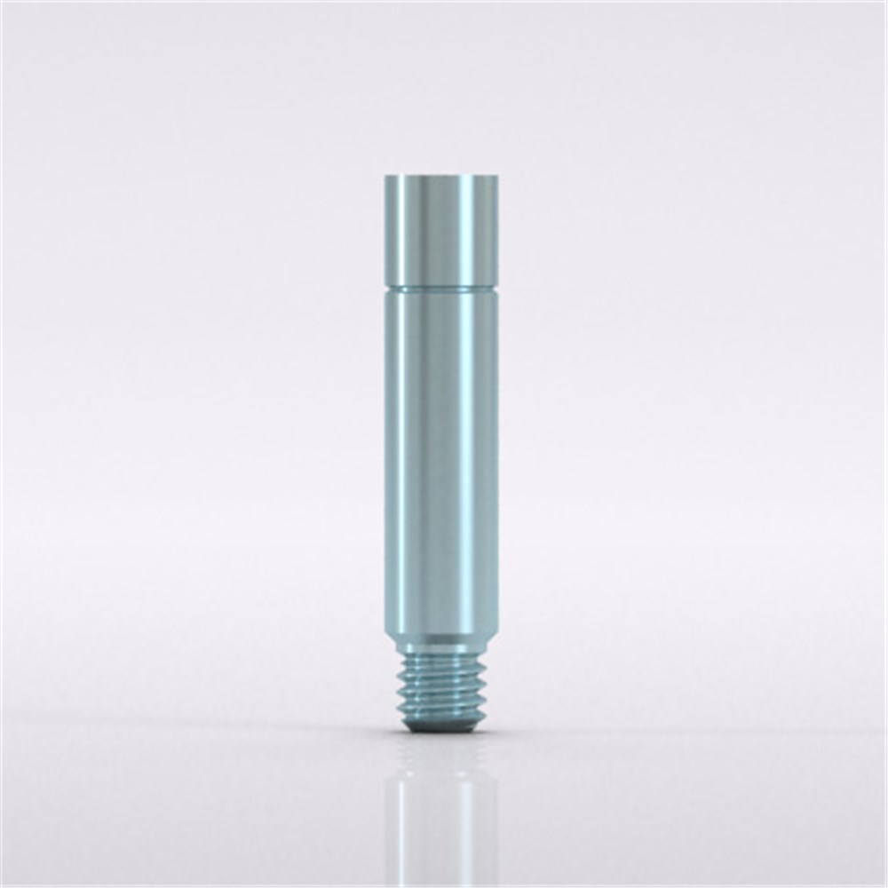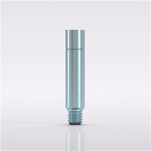 Screw, for bar abutments, for impression taking, open tray and for soldering aid, can be shortened by 2.5 mm, light blue anodized, hex, material: titanium alloy.