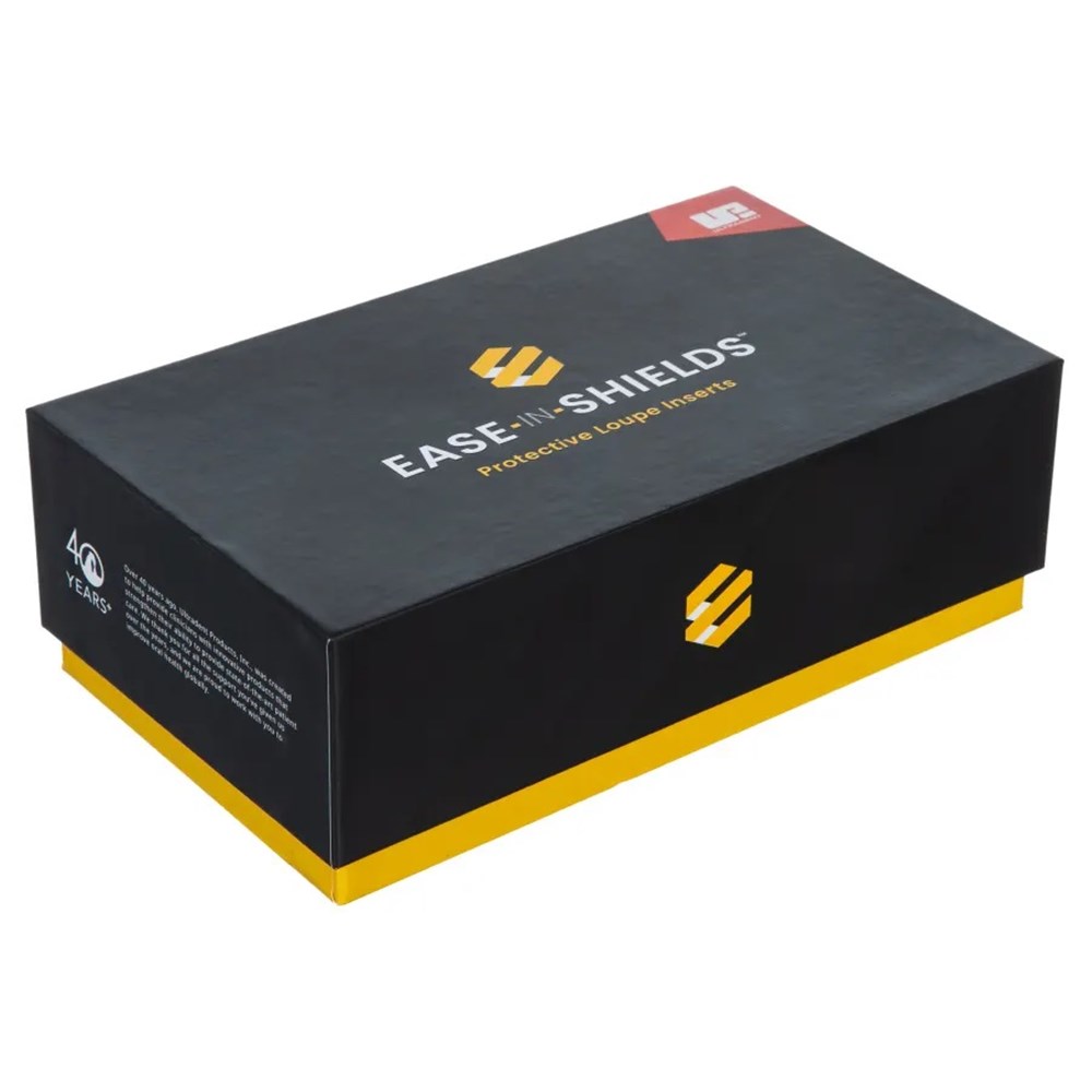Ease-In-Shields inserts are a unique protective laser filtration system designed to be worn with your loupes or other eyewear. Ease-In-Shields protective inserts rest comfortably and securely behind your loupes or eyewear and offer incredibly fast and hygienic placement and removal. Additionally, they come with an optional head strap for use without loupes or other eyewear. They feature a lightweight and strong polycarbonate construction that is less prone to fogging and are engineered to comfortably fit all facial types and virtually any kind of eyewear.