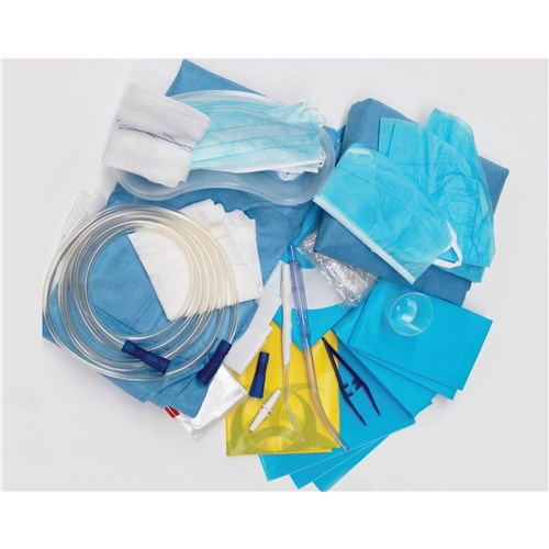 Kit contains: 3 x Surgeon Gown Grade A 2 x Face Mask Ear Loop 1 x Face Mask With Ties 2 x Head Covers With Elastic 1 x Head Covers With Ties 4 x Hand Towel 1 x Drape 90cm x 120cm 1 x Drape 75cm x 90cm 1 x U-Drape 100cm x 150cm + Adhesive + Tube Holders 1 x Outer Wrap 180cm x 140cm 3 x Adhesive Film (Blue) 20cm x 20cm 3 x Adhesive Film 5cm x 80cm 1 x Aspiration System With Tip 1 x Blue Adaptor 3 x Drill Sleeves 120cm 1 x Elastic Cap Radio Cover 1 x Galley Pot (Small) 1 x Kidney Dish 4 x Pack of 4 X-Ray Gauze Swab (7.5cm X 7.5cm) 1 x Suction Tube Connector 1 x 3 Metres of Suction Tube 1 x Yellow Bio Hazard Bag For Trash 1 x Yankuer Fine 1 x Plastic Tweezers
