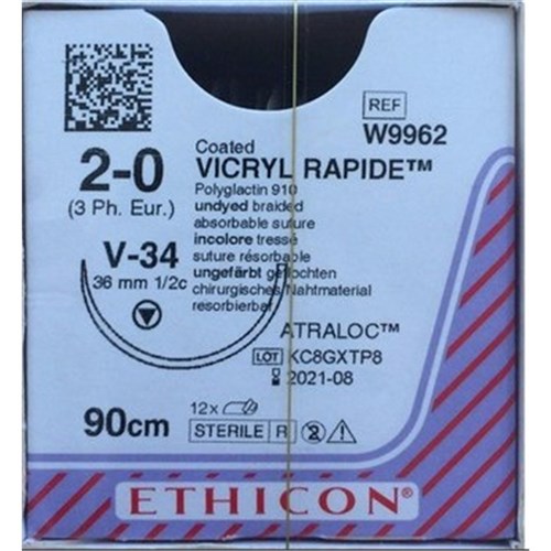 Johnson & Johnson Suture Ethicon Vicryl Rapid, 36mm, 2/0, V34, 1/2 Circle Taper Cut, 12-Pack