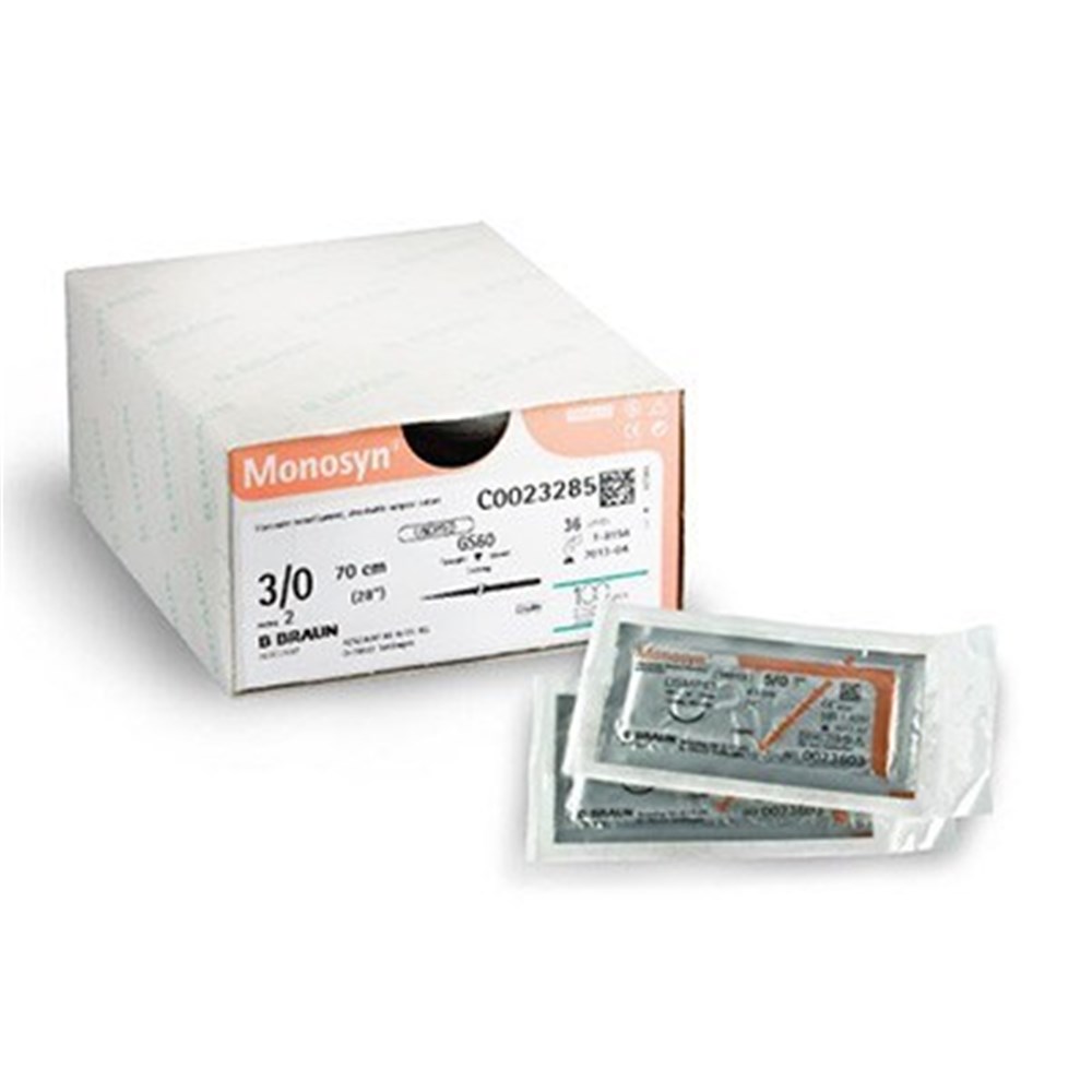 Monosyn® is a sterile synthetic absorbable monofilament surgical suture produced from a copolymer of 72% glycolide, 14% e-caprolactone, 14% trimethylenecarbonate. Monosyn® is dyed violet with the dyestuff D&C Violet No 2 (colour index number 60725), but is also available undyed (beige). Monosyn® fulfils all the requirements of the European Pharmacopoeia and of the United States Pharmacopoeia for sterile, synthetic absorbable monofilament sutures, except for minor variations in suture diameter.