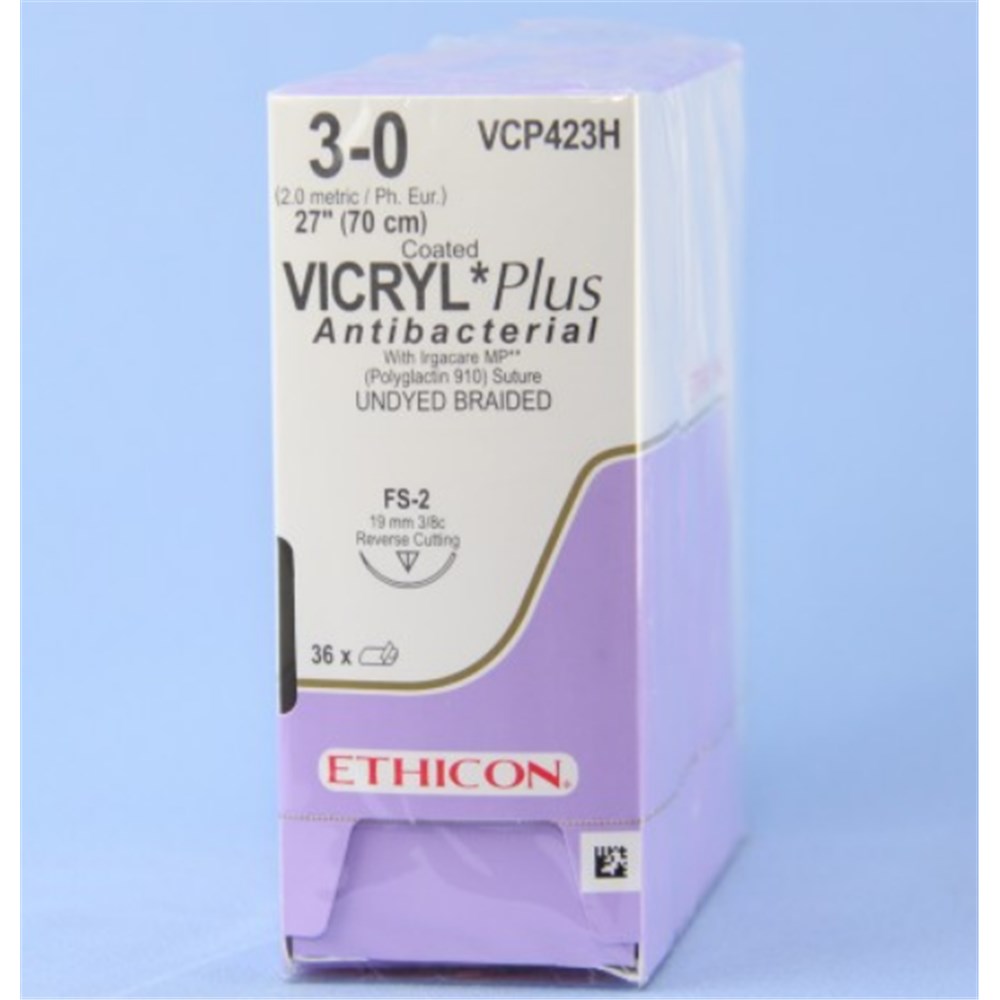 Johnson & Johnson Suture Vicryl Plus, 19mm, 3/0, FS2, 3/8 Circle Reverse Cut, Undyed, 36-Pack