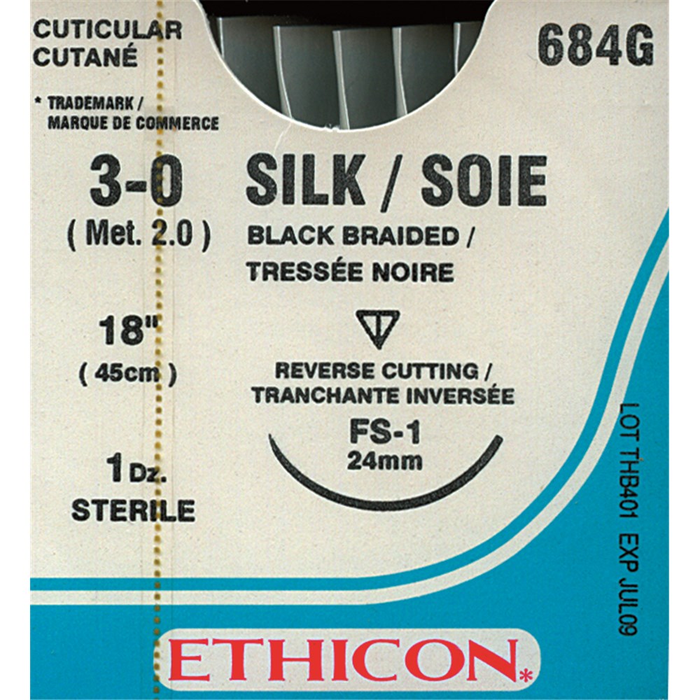 Johnson & Johnson Suture Ethicon Silk, 24mm, 3/0, FS1, 3/8 Circle Reverse Cut, 12-Pack