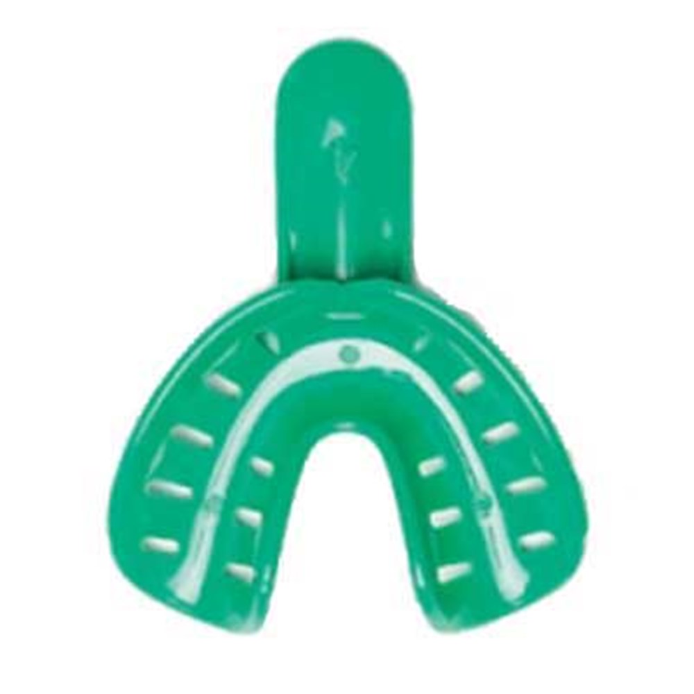 Retention Line holds alginate in place.Perforated for alginate retention.Reinforced tab for maximum strength.Rounded edges for patient comfort.Numbered and coloured for easy identification. Bag of 50 – Lower Green (Adult-Small).