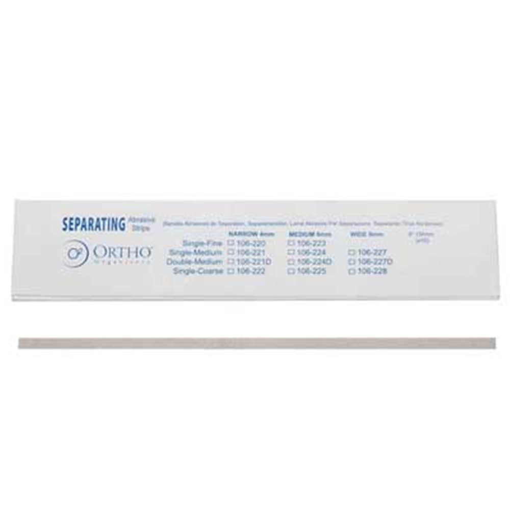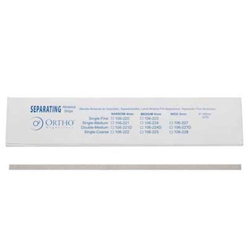 Separating abrasives strips are used to reduce and/or shape the interproximal area.  Each strip is made of durable diamond abrasive which has been electronically bonded to surgical grade steel base so strips resist stretching, breaking and corrosion. Strips are.003" thick - Medium 8mm - Double Sided. Pack of 10.