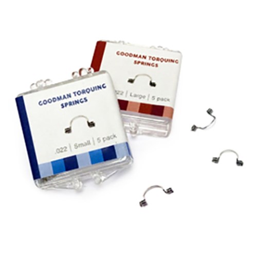 The Goodman Torquing Springs will stop relapse before it happens.  You can apply torque to any tooth from centrals to 2nd bicuspids upper or lower.  Crimps to any rectangular wire from .016 x .022 to .019 x .025.  You can deliver 125 to 150 grams of labial or lingual root torque to align roots and finish cases faster.  Use small springs for upper laterals and lower anteriors and large springs for all other teeth.   Can be used on Passive and Active Self Ligating Brackets. Goodman Torquing Spring Crimping Plier can be purchased separately.  #A800-087.Pack 5.