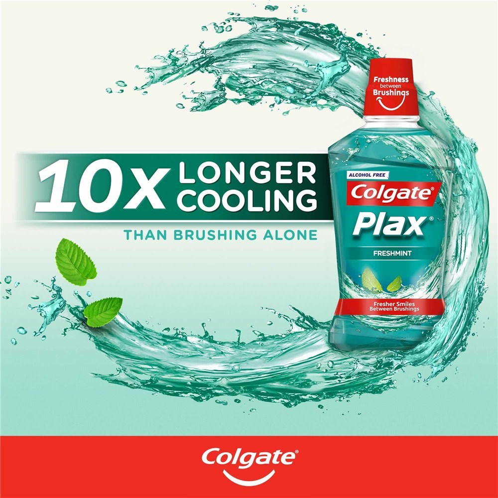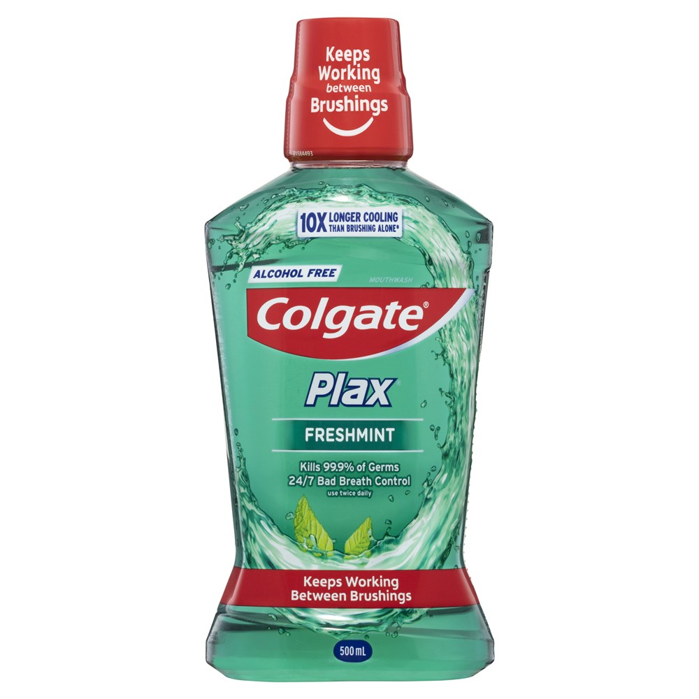 Colgate Plax Antibacterial Alcohol Free Fluoride Mouthwash Freshmint kills up to 99.9% of germs and used twice daily provides 24/7 bad breath control for long lasting freshness.