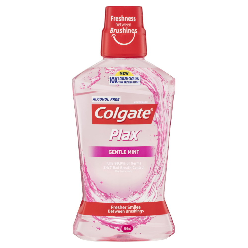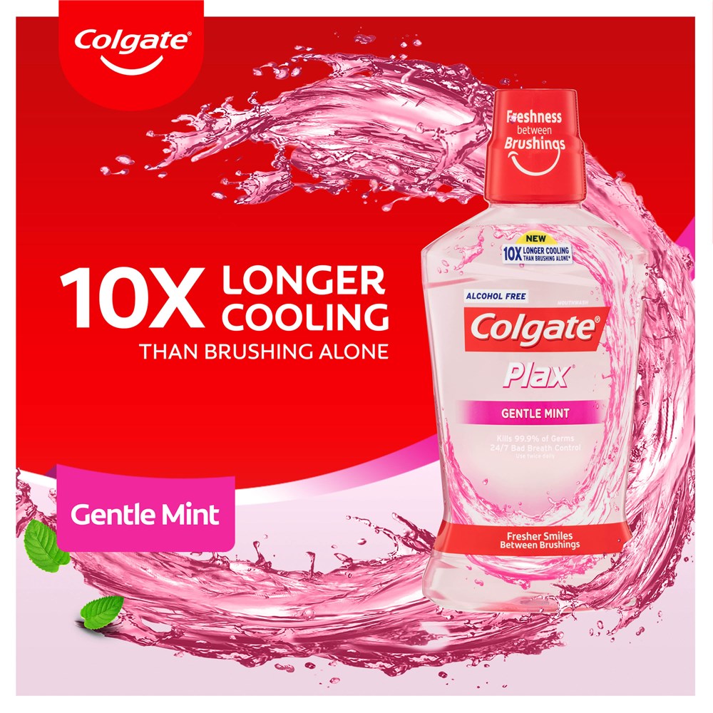 Colgate Plax Antibacterial Alcohol Free Fluoride Mouthwash Gentle Mint kills up to 99.9% of germs and used twice daily provides 24/7 bad breath control for long lasting freshness.