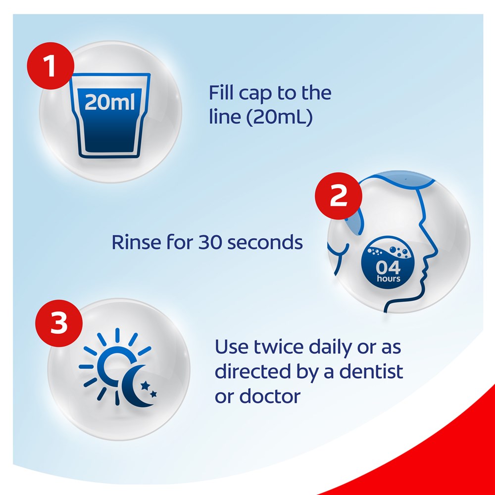 Keep out of reach of children. Fill cap to the line (20mL). Rinse mouth thoroughly for 30 seconds twice daily, gargle and expel. Do not swallow. Do not dilute. Do not use if cap seal is broken. Not recommended for children under 6 years.