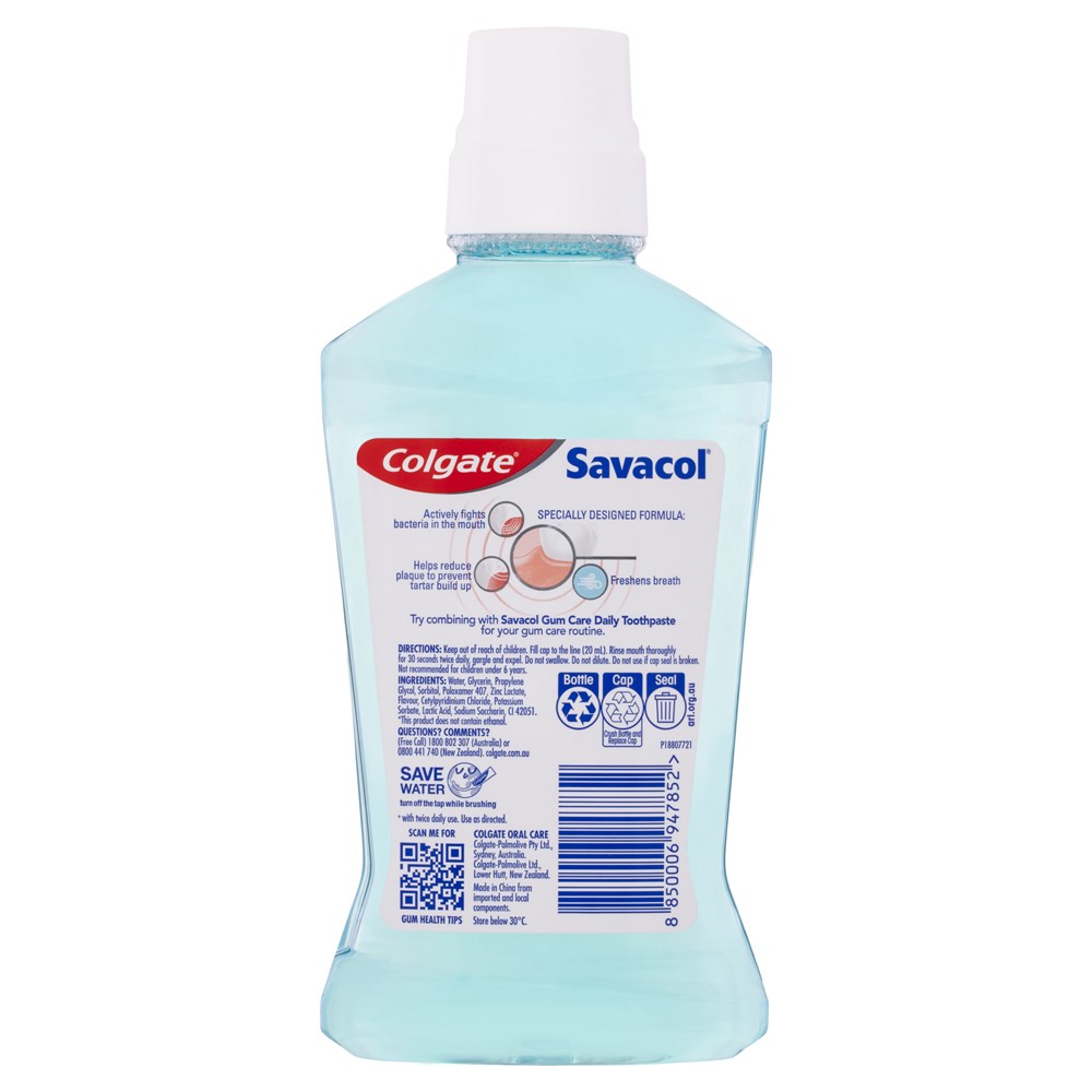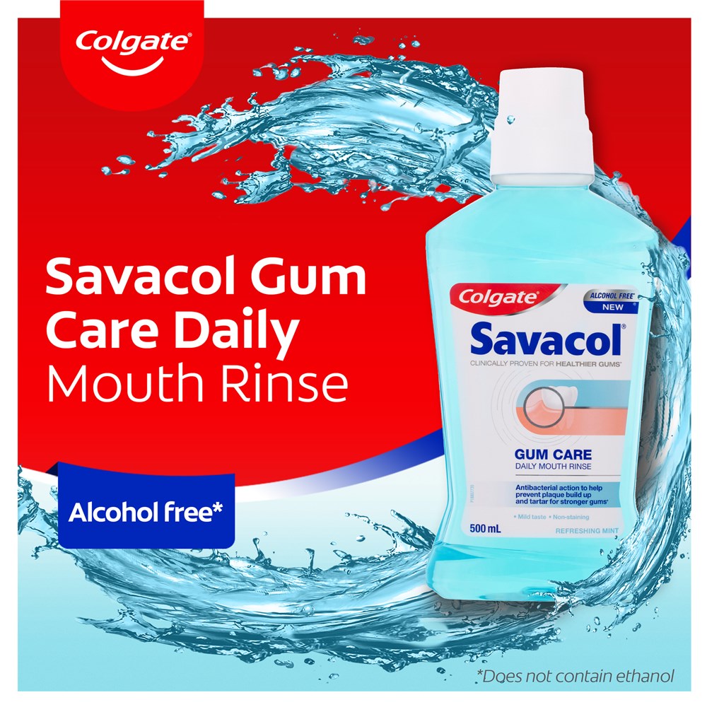 Colgate Savacol Gum Care mouthwash is clinically proven for healthier gums*. The specially designed formula actively fights bacteria in the mouth, helps reduce plaque to prevent tartar build up and freshens breath.