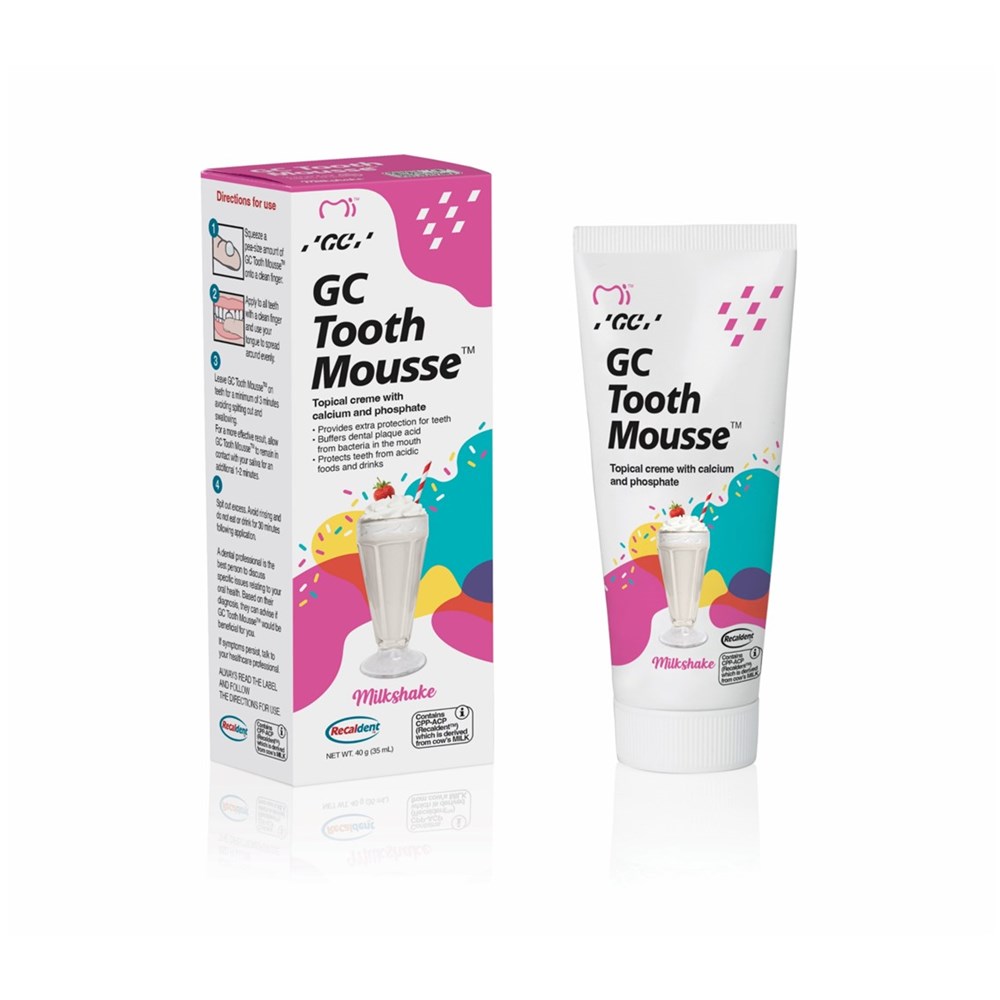 GC Tooth Mousse contains CPP-ACP (RECALDENT) which is derived from cow’s milk. GC Tooth Mousse also contains hydroxybenzoates and soybean products. Do not use this product if you have a suspected or proven allergy to milk proteins or benzoate preservatives. In case of an allergic reaction: stop use, rinse mouth with water and seek medical advice. RECALDENT and RECALDENT logo are trademarks of Mondelēz International group used under license.