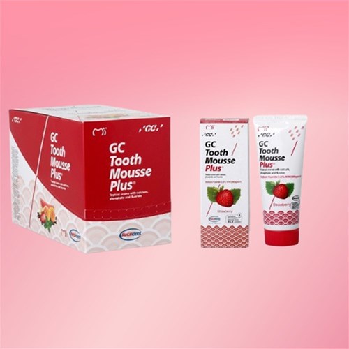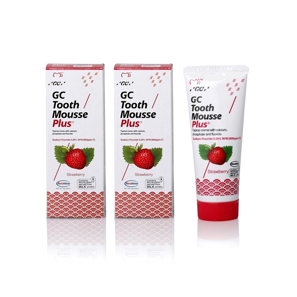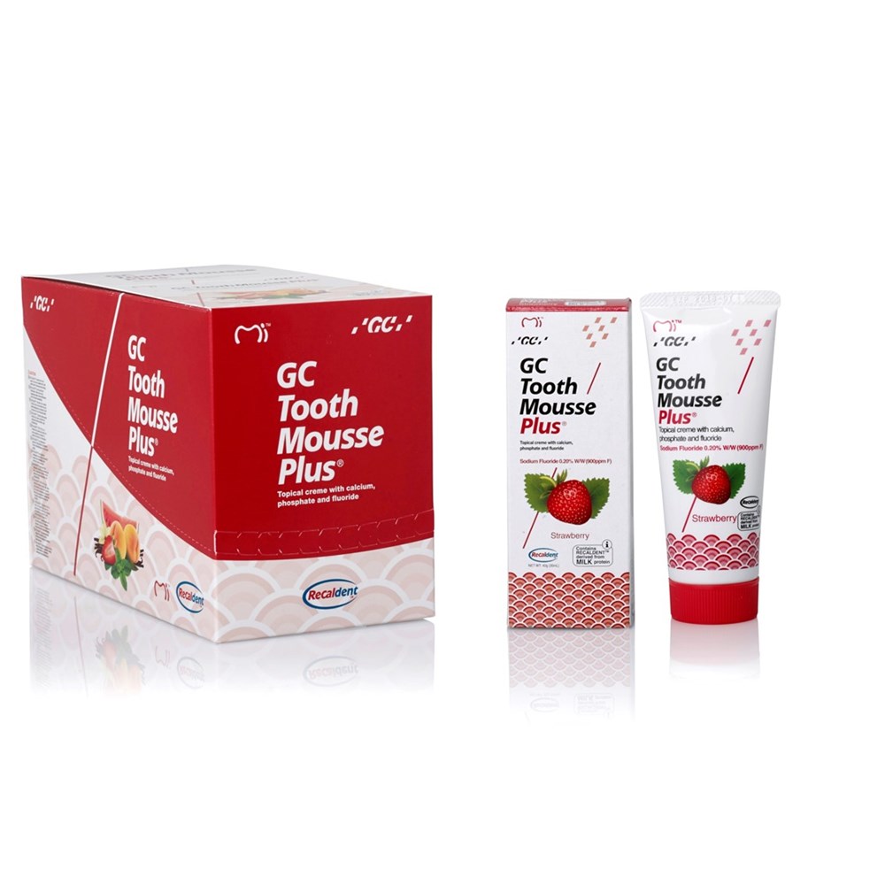GC Tooth Mousse Plus is a delicious tasting creme containing a milk-derived protein called RECALDENT® with incorporated fluoride (CPP-ACPF: casein phosphopeptide-amorphous calcium phosphate fluoride).