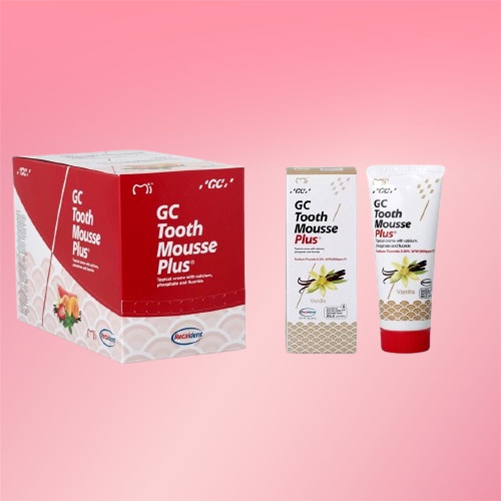 GC Tooth Mousse Plus is a delicious tasting creme containing a milk-derived protein called RECALDENT® with incorporated fluoride (CPP-ACPF: casein phosphopeptide-amorphous calcium phosphate fluoride).
