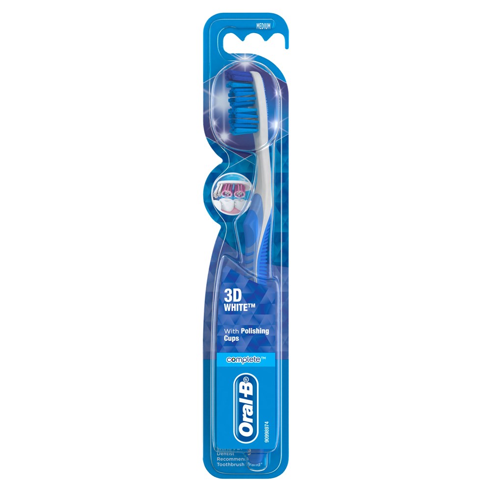 Oral-B® 3DWhite Clean Fresh White Manual Toothbrush with unique polishing cup bristles that holds the toothpaste to polish away surface stains for a naturally whiter smile plus extra long Power Tip® bristles that help clean hard-to-reach areas.