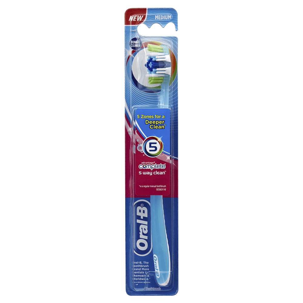 The New Oral B Complete 5-Way Clean toothbrush has 5 cleaning zones and a 2.5x deeper reach. Its 5 cleaning zones go beyond ordinary toothbrushes to remove up to 90% of plaque bacteria. Each cleaning zone provides a distinct cleaning benefit including hard to reach areas, in-between teeth, whitening, along the gumline, and on the tongue and cheek. The toothbrush gives users a comfortable whole mouth clean experience and is easy and effortless to use.