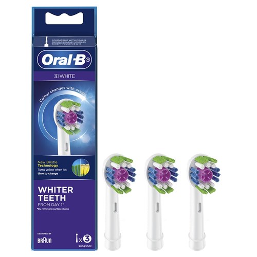 New Bristle Technology: Oral-B 3DWhite brush head turns from green to yellow, indicating when it is time to change.