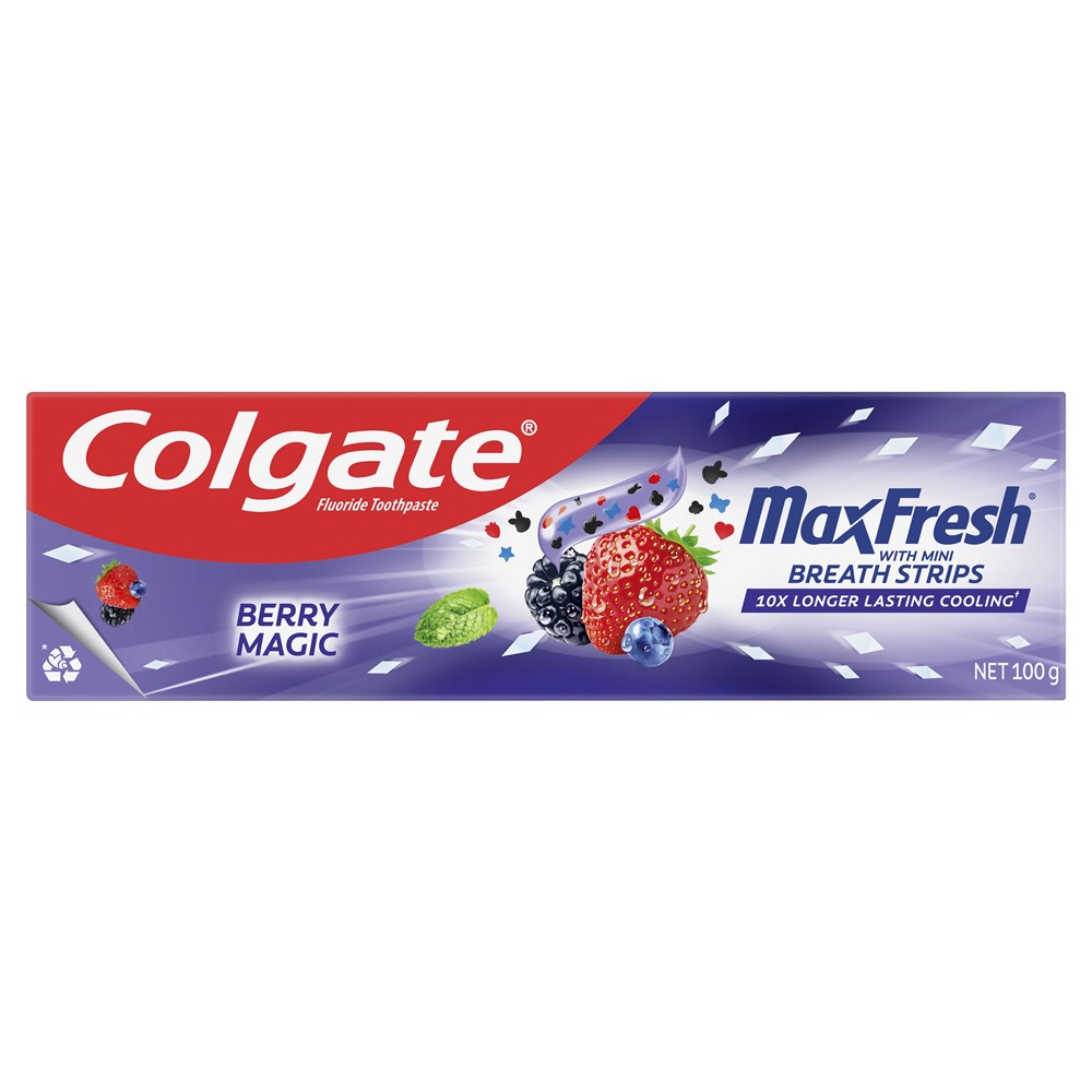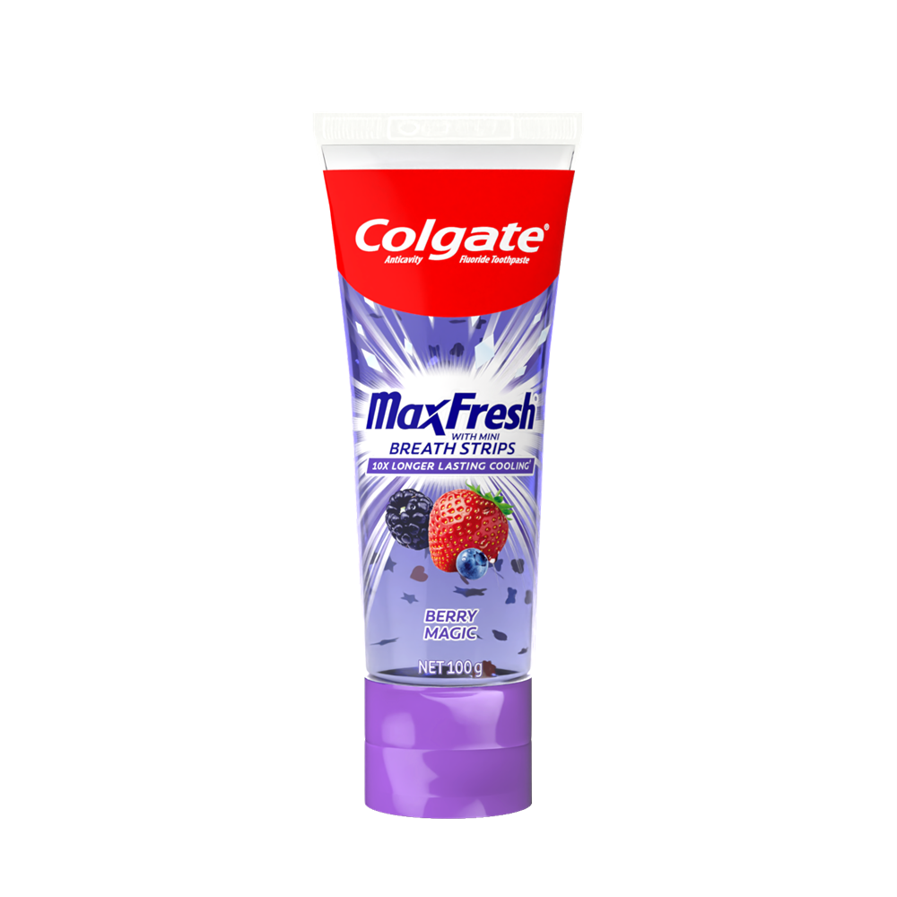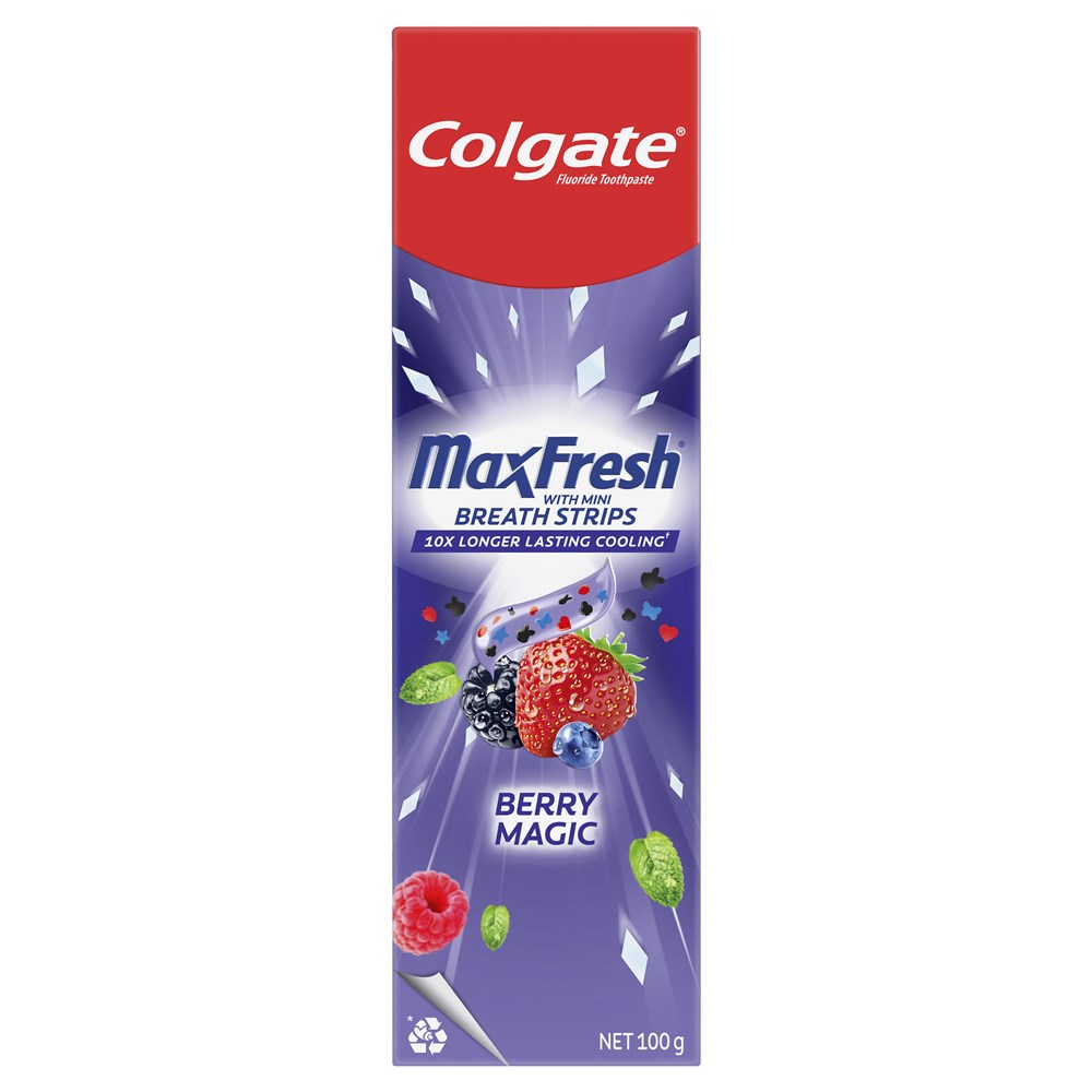 Experience a flavour explosion with Colgate Max Fresh Berry Magic + Fluoride toothpaste with mini breath strips.