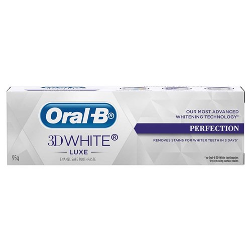 Experience Oral-B 3DWhite Luxe Perfection Toothpaste , our fastest and most advanced teeth whitening technology vs Oral-B 3DWhite toothpaste. The innovative enamel-safe formula enhances your smile’s beauty by using stain dissolving particles technology to unlock trapped surface stains on your teeth and protect against new stains. Plus, enjoy the refreshing flavor with extra coolant that leaves you feeling fresh long after use.Features and Benefits: