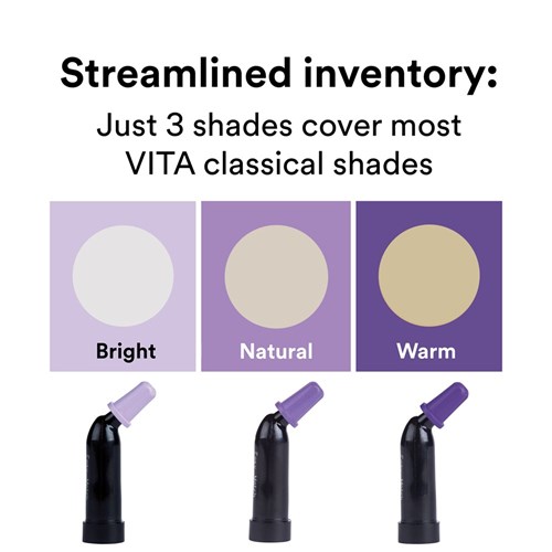 • Just three shades (Bright, Natural and Warm) to match the classical VITA shade guide