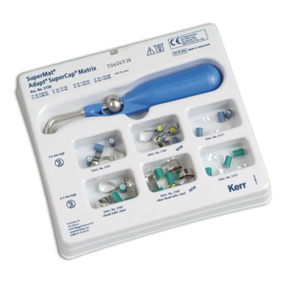 Contents: 1 x SuperLock™ tensioning instrument; 14 x Adapt™ SuperCap™ matrices in steel assorted; 6 x Adapt™ SuperCap™ matrices, transparent assorted