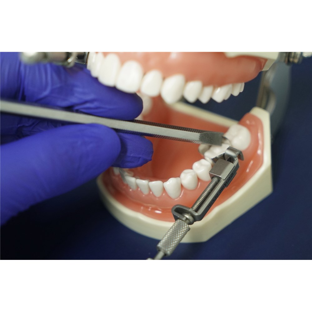 The Maestro Matrix Master features a double-sided design: one side facilitates the placement of matrix bands, while the other aids in their removal. The placement side incorporates a fork-like design with carefully positioned slots, enabling perpendicular engagement with the matrix band surface and facilitating precise force application. Additionally, it includes a knurled base that enhances grip when securing the band in the seated position during tightening. The opposite end of the Matrix Master utilises a teardrop to aid safe removal of the band.