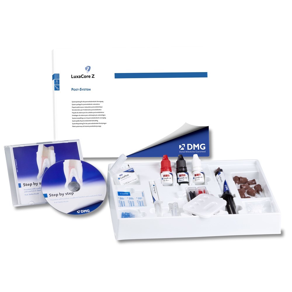 Complete system for post endodontic restorations, combining LuxaCore Z, LuxaPost and LuxaBond. With the premium composite LuxaCoreZ-Dual DMG now offers the logical further development of the success material as an ideal partner for LuxaPost, the quality glass fiber reinforced composite post, and the adhesive system LuxaBond-Total. Combined these specialty products make up a carefully co-ordinated system for professional post-endodontic restorations. Homogenous monoblock. Reliable bond LuxaCore Z as core build up material. LuxaPost as pre-silanized post. LuxaCore Z as post cement. LuxaBond as dual curing bond.
