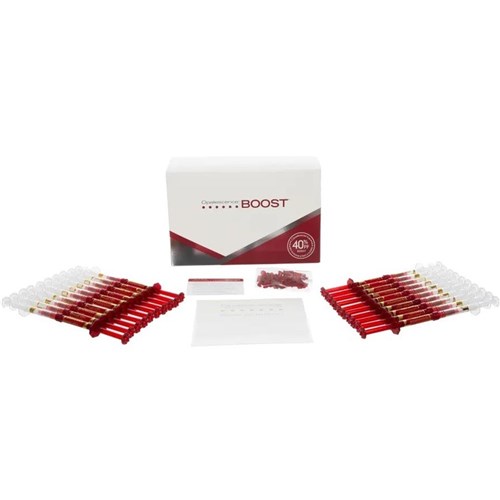 Opalescence Boost in-office power whitener is a chemically activated gel that provides brighter, whiter teeth after about an hour in the dental chair. The powerful 40% hydrogen peroxide gel is chemically activated, so it doesn’t require a hot, uncomfortable light to work. Using the unique double-syringe configuration, the clinician activates the 40% hydrogen peroxide formula just prior to application, ensuring every dose of Opalescence Boost whitening is fresh and effective.