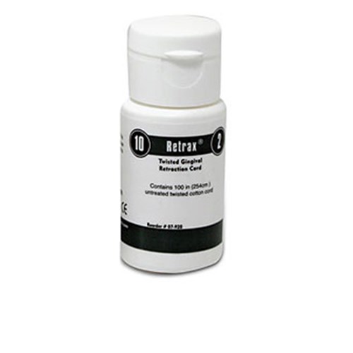 Twisted retraction cord. Soft, absorbent cord of long fiber cotton. Tightly wound to prevent unravelling and fraying during packing.