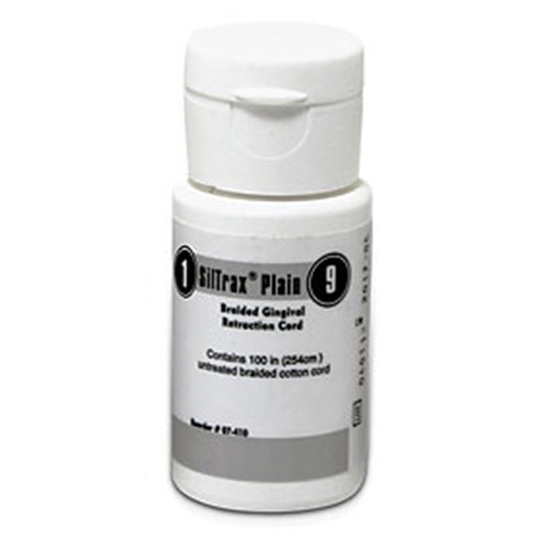 Plain braided retraction cord. Braided cotton cord strands will not separate, and packing instruments will not penetrate and seize the cord strands.