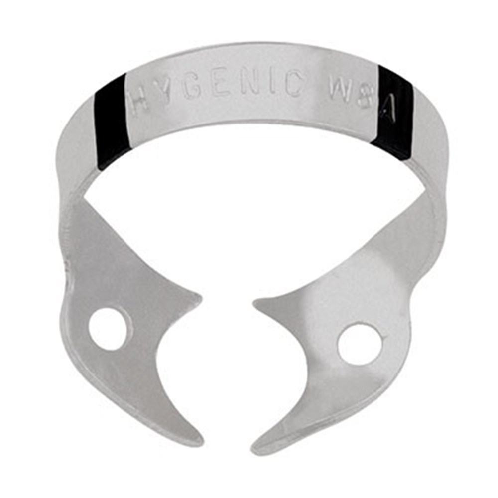 First the clamp is positioned intraorally, then the dental dam stretched over the clamp and tooth. Wingless clamps are designated with a „W“ (wingless) for easy identification.